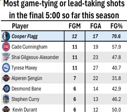 12月17日,美国媒体Extra晒出本赛季,NBA球员最后五分钟投进追平或者反超球的数据!其中弗拉格命中率最高,本赛季关键时刻,他17投12中,命中率高达70.6%,排名弗拉格之后的坎宁安和亚历
